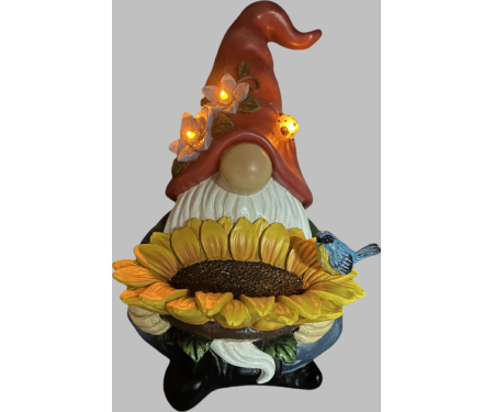 A 14.2″ resin bird feeder featuring a gnome holding a sunflower-style feeding bowl. Designed for outdoor use with weather-resistant resin construction. Suitable for gardens, patios, and feeding areas. Easy to place on flat surfaces.