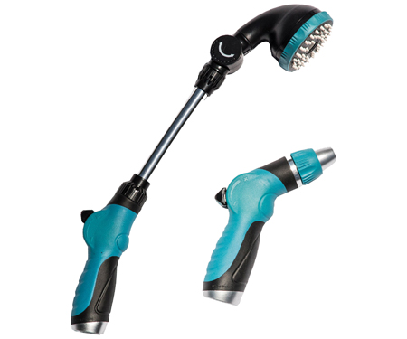 This 2-piece combo pack comes with a 16″ 2-pattern watering wand with a 180 degree adjustable head and a thumb control zinc inlet soft grip, adjustable nozzle.