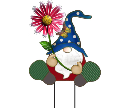 A 24″ metal garden stake featuring a gnome holding a flower. Designed with welded metal construction and dual stakes for stable placement in soil or mulch. Suitable for garden beds, planters, and landscape accents. Durable finish for outdoor use.