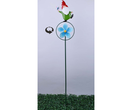 Gnome in green outfit with red hat stands atop a spinner stake with a bright blue flower in the middle. Create movement in your garden. Made of metal, 41.2″H x 1.38″D, 5.83″L.