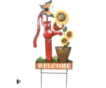 A 53″ metal garden stake featuring a pump, sunflowers, and a ?Welcome? sign. Built with dual ground stakes for stable outdoor placement. Suitable for garden beds, entry areas, and landscape d?cor. Durable metal construction for outdoor use.