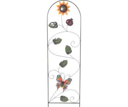 Sturdy powder-coated steel trellis with hand-painted, brightly-colored ladybug, butterfly, flower, and leaf accents.