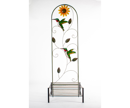 Sturdy powder-coated steel trellis with hand-painted, brightly-colored hummingbird, flower, and leaf accents.