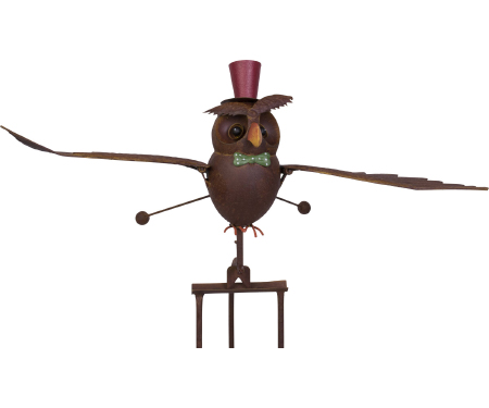 The Terra Verde Home Rocking Bird Garden Stakes provide a unique and whimsical accent for any garden. This elegant owl features a top hat and bow tie, and rocks back and forth on its steel stake in the wind. Attractive rust finish.