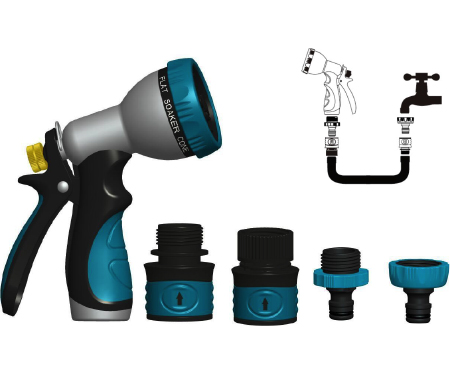 Quick connect set to easily connect a hose nozzle to an outdoor faucet or garden hose. Includes 9-pattern hose nozzle.